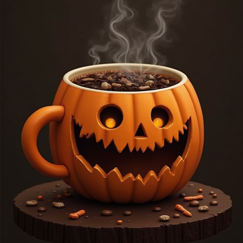 This unique pumpkin mug filled with a warm drink has glowing eyes and smoke rising, perfect for Halloween celebrations.