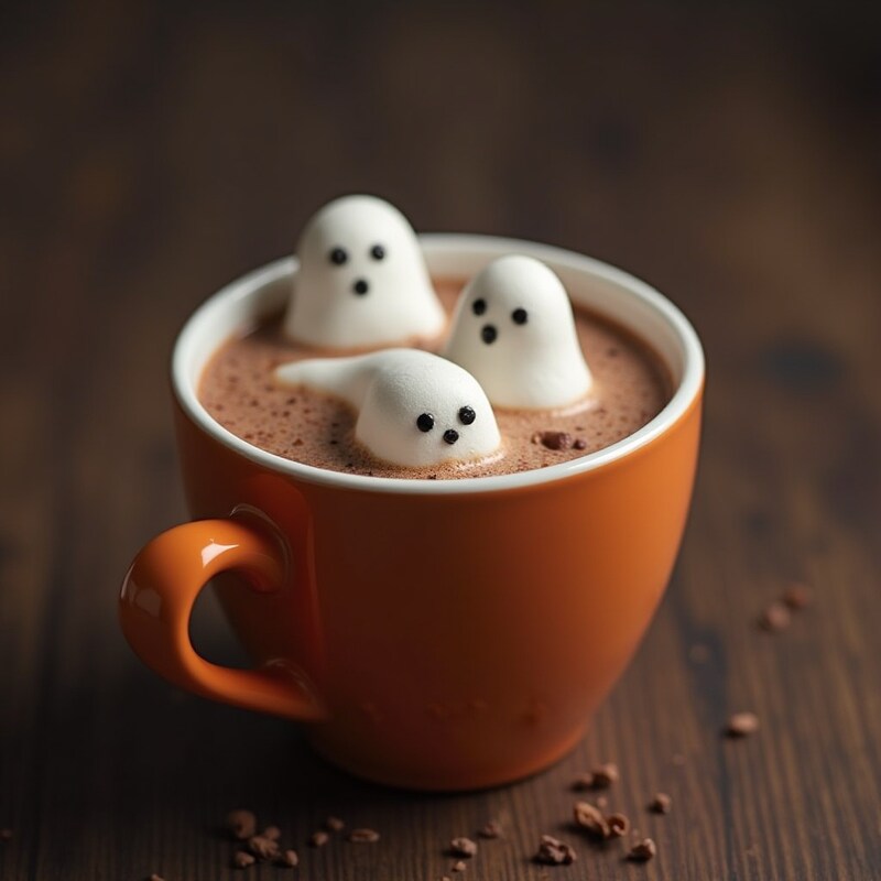 Halloween, beverage, chocolate, coffee, cozy, decoration, dessert, festive, food styling, fun, ghosts, hot chocolate, marshmallows, orange mug, playful, spooky, sweets, treat, warmth, winter