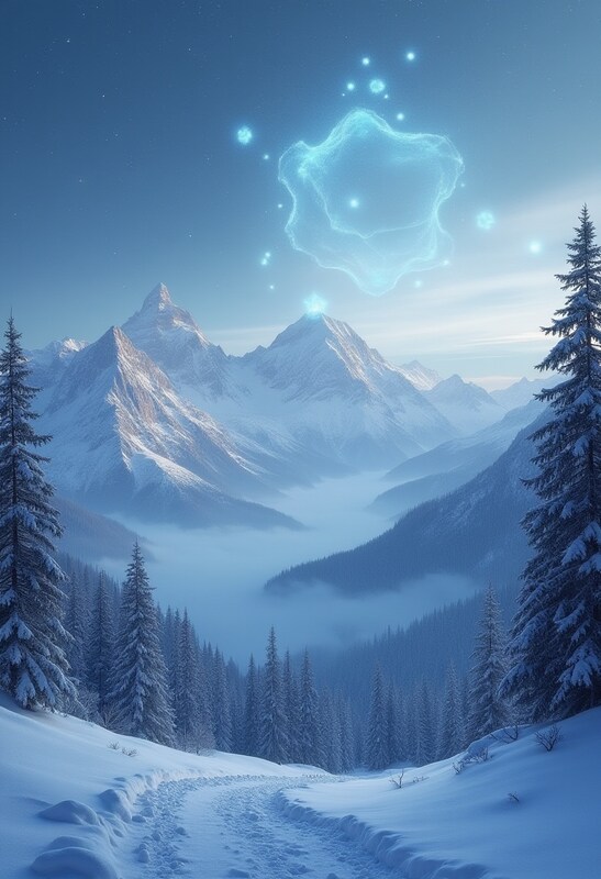 Snowy mountains rise majestically under a bright sky, with a mysterious glowing shape hovering above the peaks during twilight.