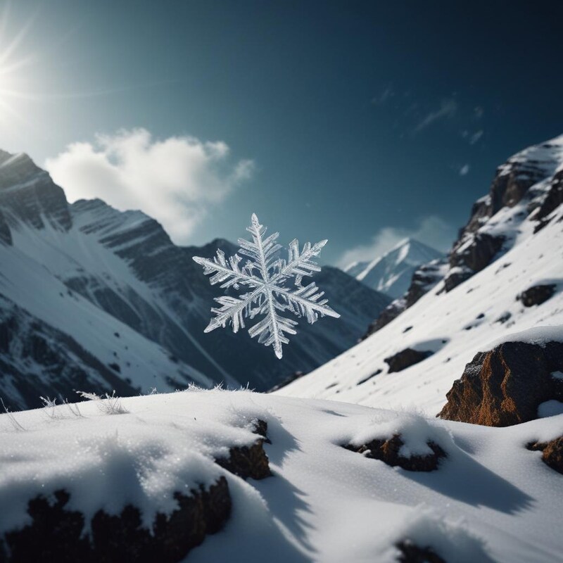 A detailed snowflake is gently resting on a snow-covered surface in a majestic mountain terrain under a bright blue sky.