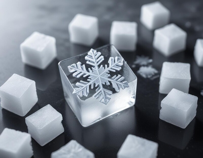 beverage, clear, cold, cooling, crystallized, dark surface, decoration, design, drink, elegant, food, ice cube, ingredients, party, refreshment, snowflake, sugar cubes, sweet, textures, winter