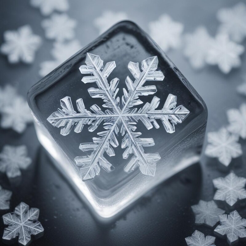 A clear ice cube holds a detailed snowflake on a background of smaller snowflakes, showcasing winter's intricate beauty.