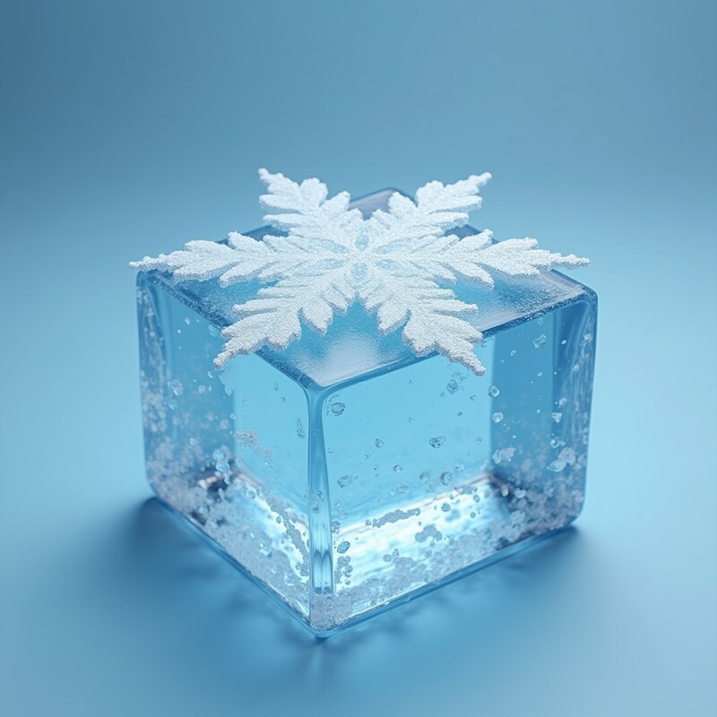 A clear ice cube sits on a blue surface, featuring a snowflake design on top. Bubbles and a cool ambiance enhance the winter theme.