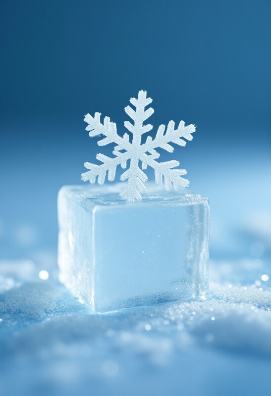 Ice cube with a snowflake on top in a winter setting