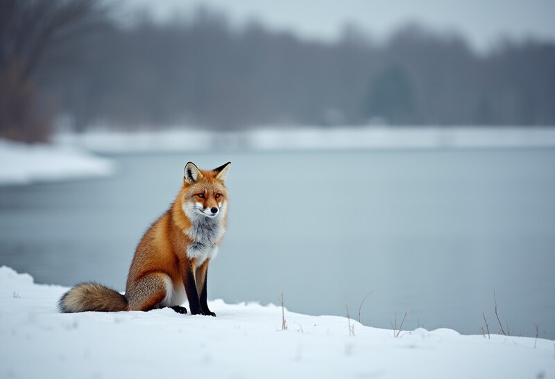 A red fox sits quietly on the snowy shore of a lake, surrounded by a serene winter landscape, under a cloudy sky.