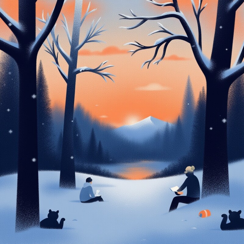 Two individuals relax in a snowy forest as the sun sets behind distant mountains. A calm evening with charming wildlife adds to the scene.
