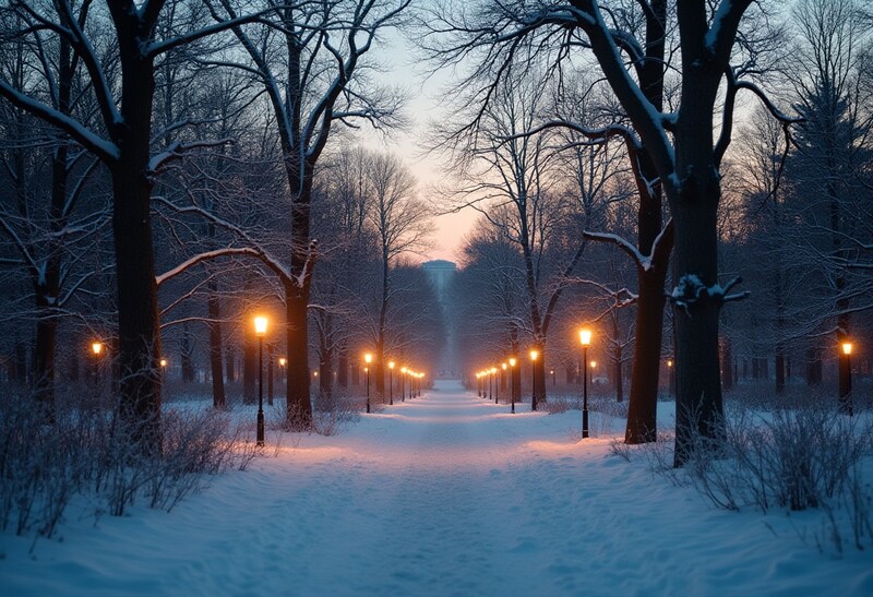 Snow blankets the ground and trees in a quiet park. Street lamps glow softly, illuminating the path during twilight.
