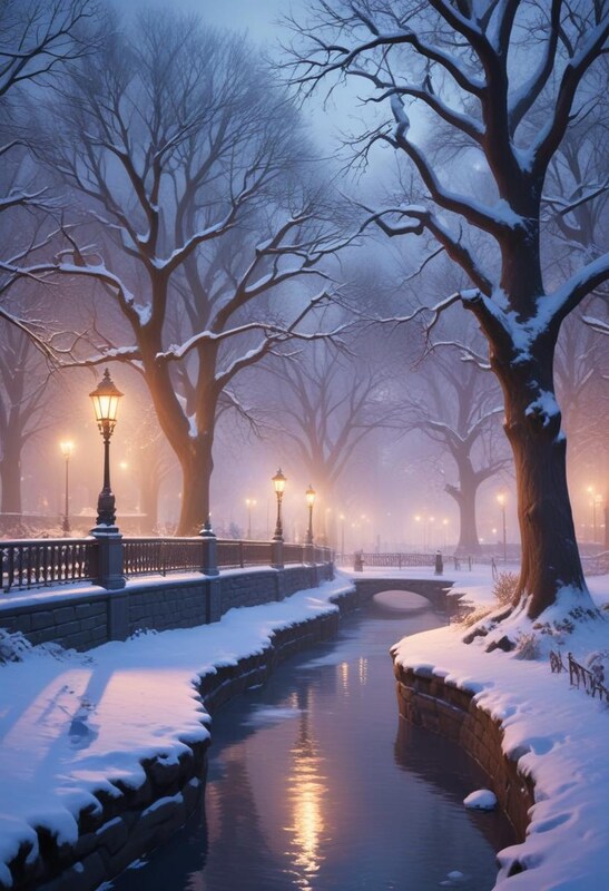 Soft snow blankets the park as lampposts illuminate a quiet path, creating a peaceful winter evening setting by the water.