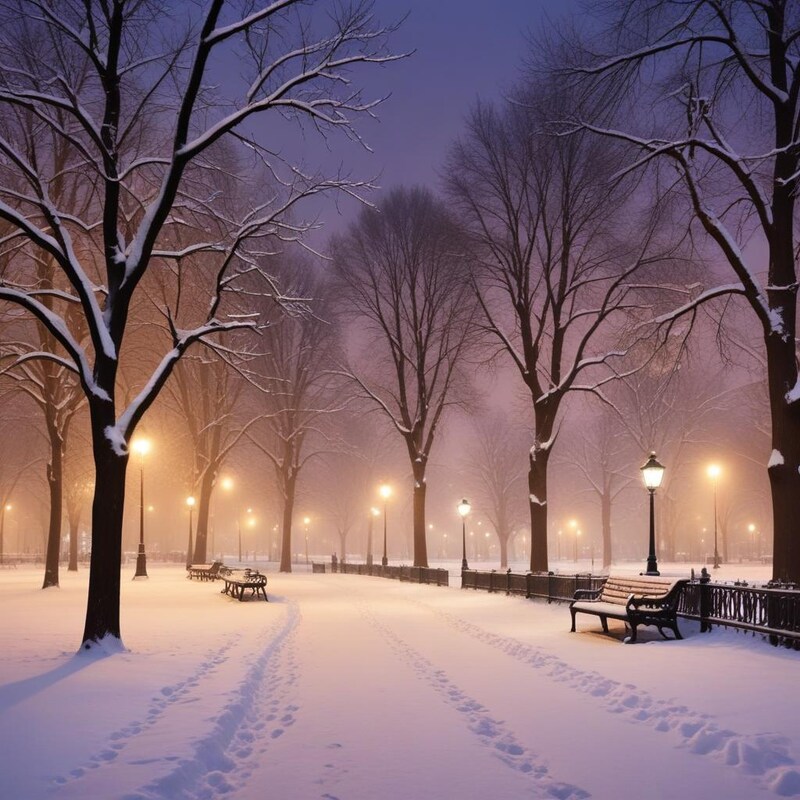 A serene park path is blanketed in snow, with benches lining the way and street lamps casting a warm glow in the evening mist.
