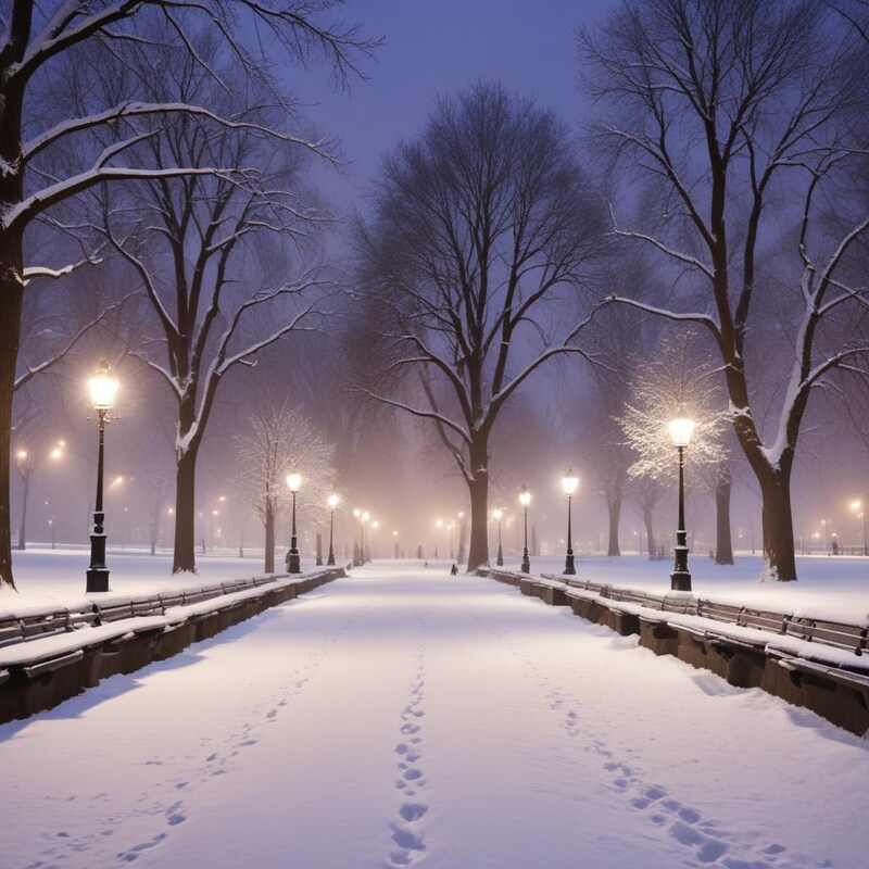 Snow covers a quiet park path lined with street lamps, creating a peaceful winter scene under a dim sky during the evening.