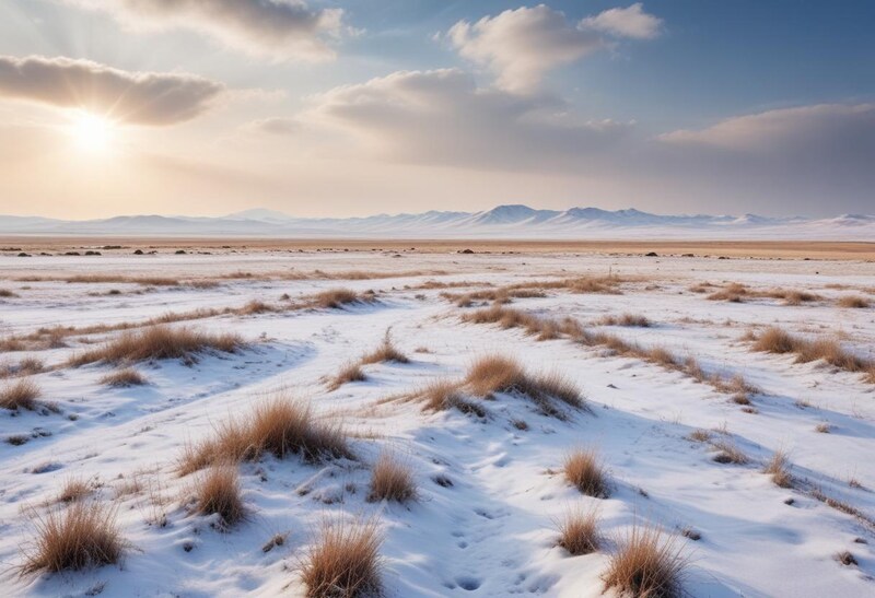 A scenic view of a snowy field with soft grass tufts under a warm sunset sky. Mountains are visible in the distance, creating a peaceful atmosphere.