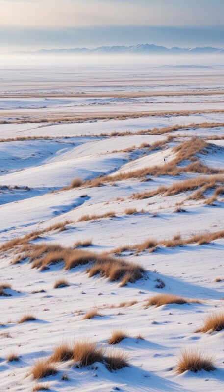 Wide view of snow-covered plains with patches of grass and distant mountains. The scene captures the calmness of a winter day.
