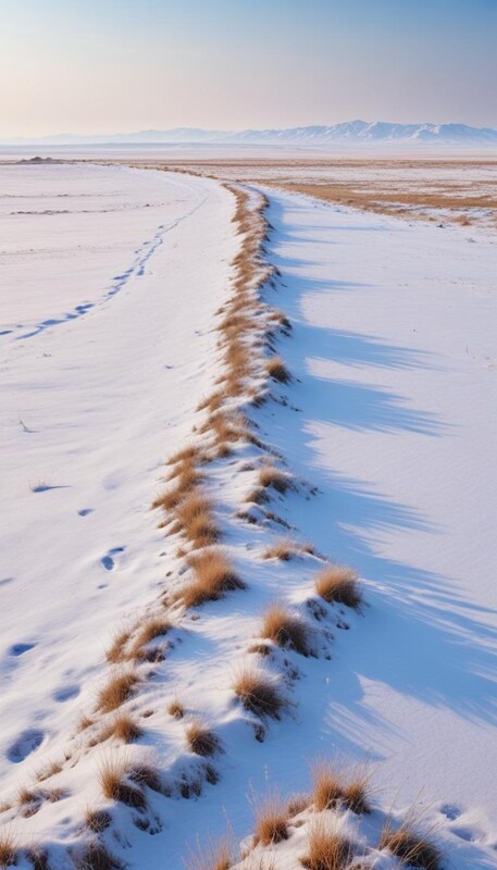 Snow-covered landscape with grassy path in winter