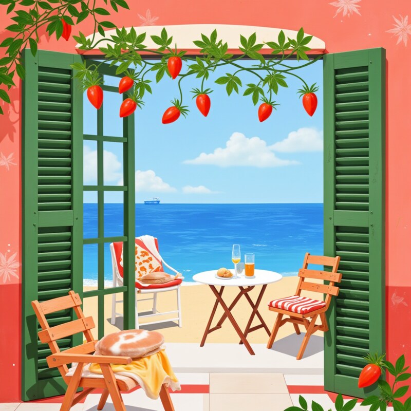 A serene beach scene shows two chairs and a small table with drinks, surrounded by fresh strawberries and bright blue ocean.
