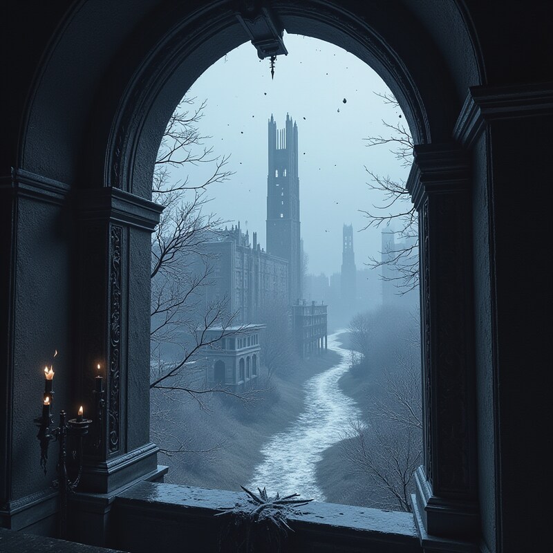 A foggy scene shows ancient, crumbling buildings beside a tranquil river under a gloomy sky, creating an eerie atmosphere.