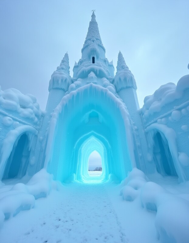 attraction, blue light, chill, cloudy sky, cold, entrance, frozen structure, ice castle, icy architecture, landscape, magical, outdoor, pathway, scenery, snow, tourism, towers, winter, winter festival, winter wonderland