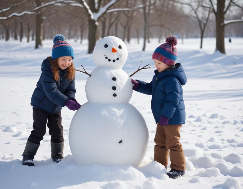 Two children play in a snowy park, joyfully creating a snowman with sticks and a carrot. They wear warm hats and jackets.