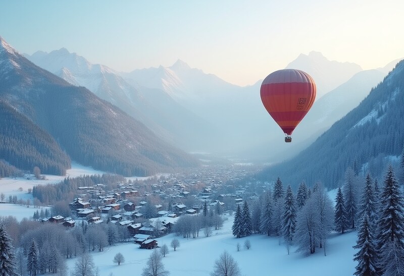 Hot air balloon gliding over snowy valley landscape