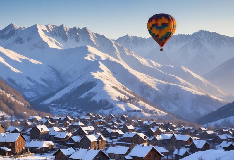 A colorful hot air balloon ascends above a snowy mountain village during sunrise, offering a breathtaking view of the picturesque landscape.