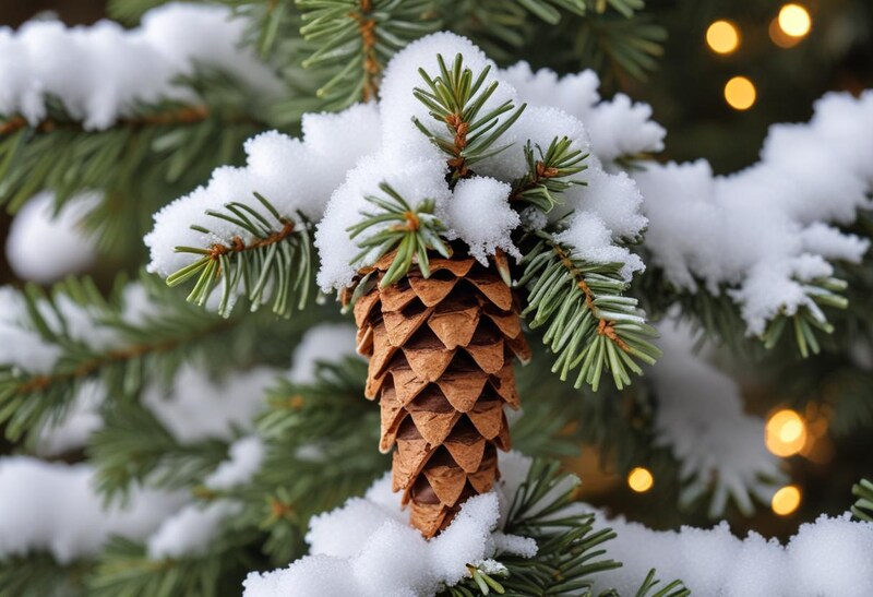 branches, close-up, cold weather, decoration, evergreen tree, festive, forest, greenery, holiday, holiday lights, nature, outdoor, pine cone, pine needles, seasonal, snow, snowfall, tranquil, winter, winter scene