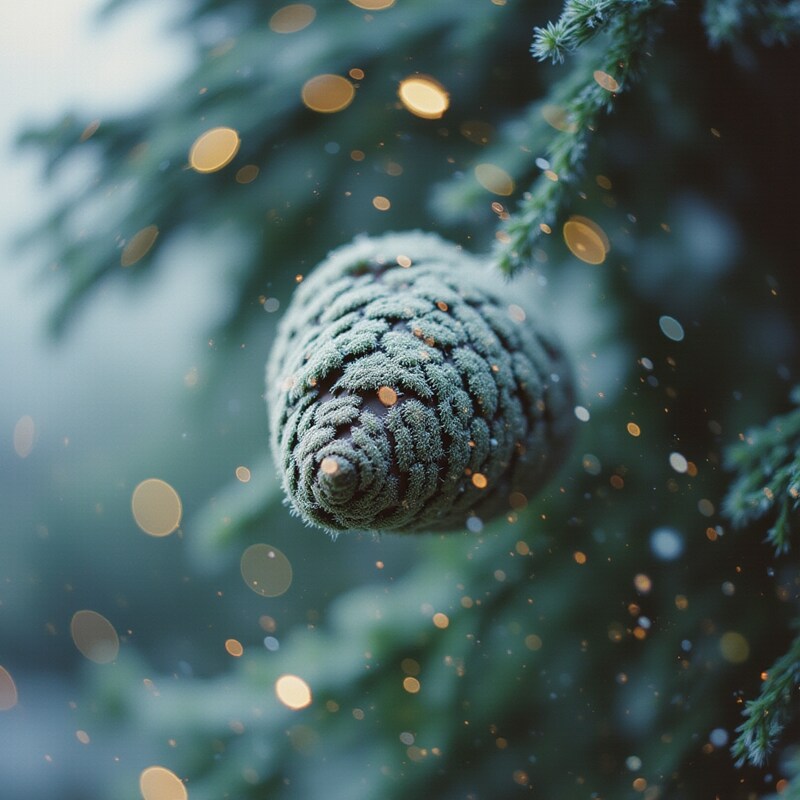 A pine cone covered in snow hangs from a branch while gentle snowflakes fall around it, creating a serene winter scene.
