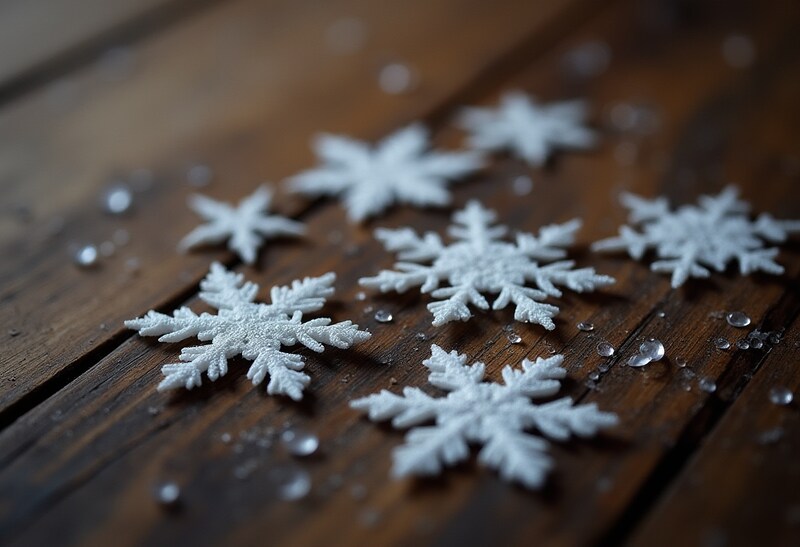 White snowflake decorations rest on a wooden table, surrounded by small water droplets, creating a cozy winter atmosphere.