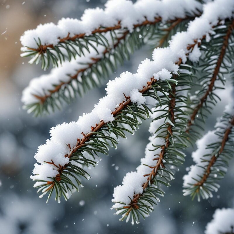 Snow gently blankets the pine branches, creating a serene winter scene filled with quiet beauty and chilly peace.