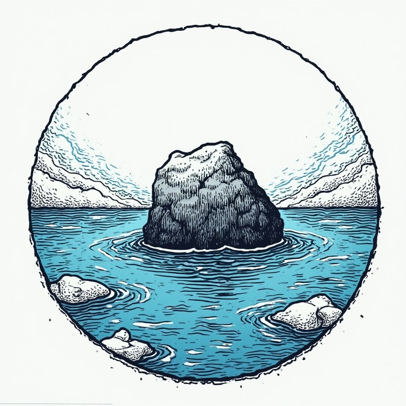 A large rock stands alone in clear blue waters, surrounded by small stones and gentle waves under a cloudy sky, creating a peaceful scene.
