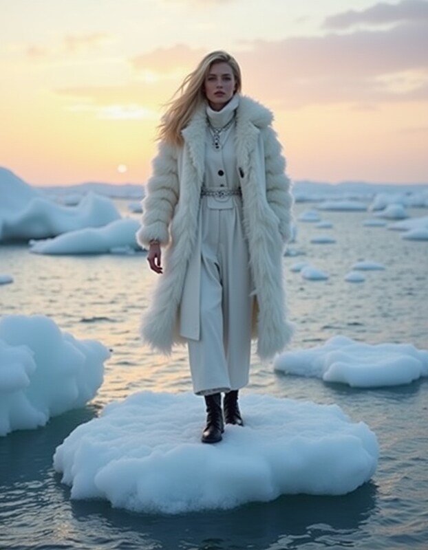 Model strolls on icy island at sunset in chic wear