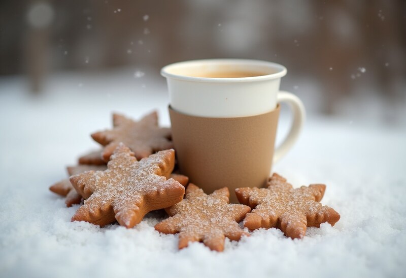 baked goods, comfort, cozy, decoration, dessert, drink, festive, food, gingerbread cookies, handmade, holiday, hot beverage, outdoor, seasonal, snow, snowflakes, sweet treat, warm drink, winter scene, winter wonderland