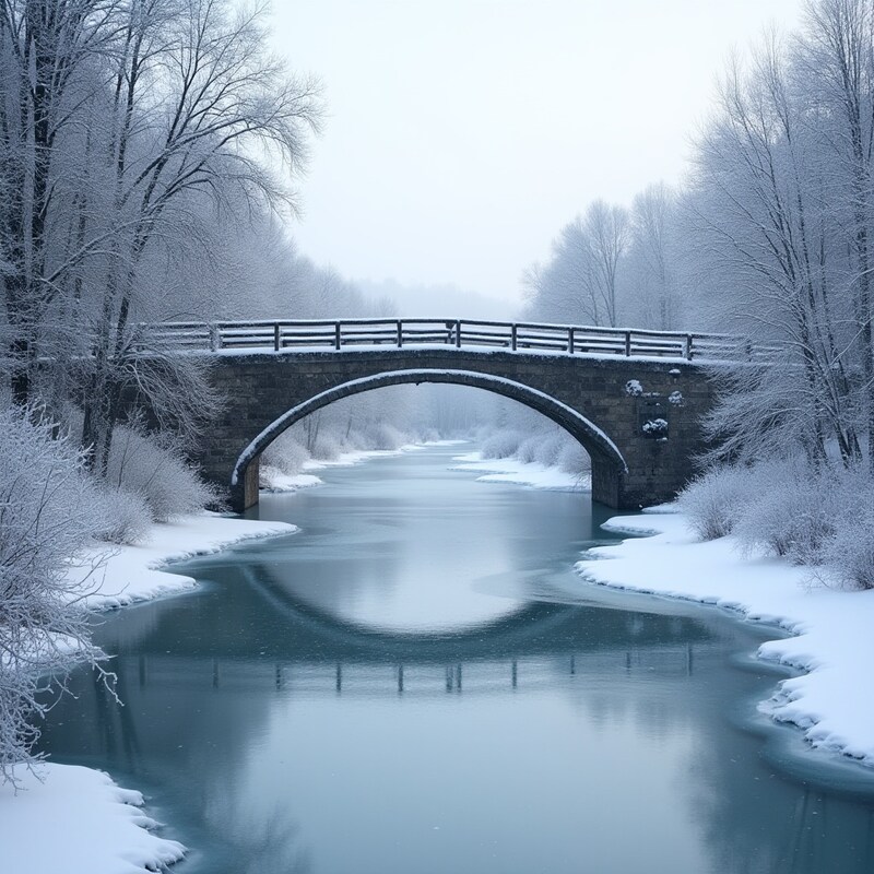 A snow-covered landscape features a stone bridge arching over a calm river. Frosty trees line the banks, creating a serene winter view.