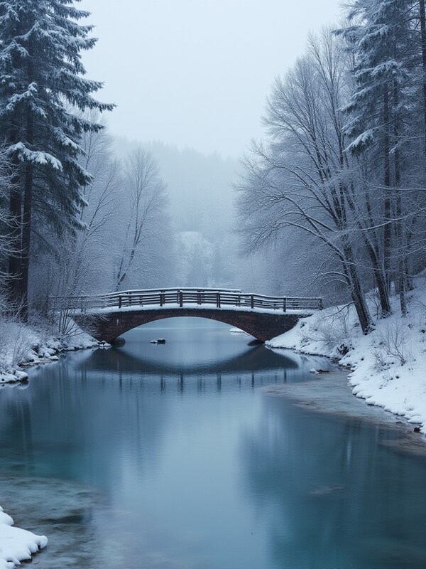 A tranquil river reflects a snowy landscape with a charming stone bridge and tall trees covered in white. The scene captures winter's beauty.