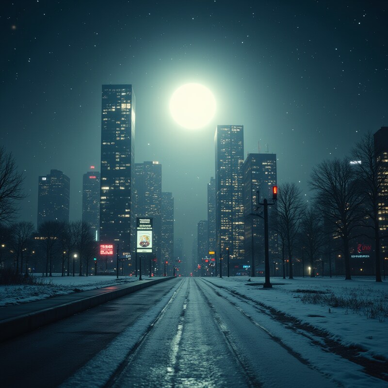 Snow covers the urban landscape as bright moonlight illuminates towering buildings on a quiet street.
