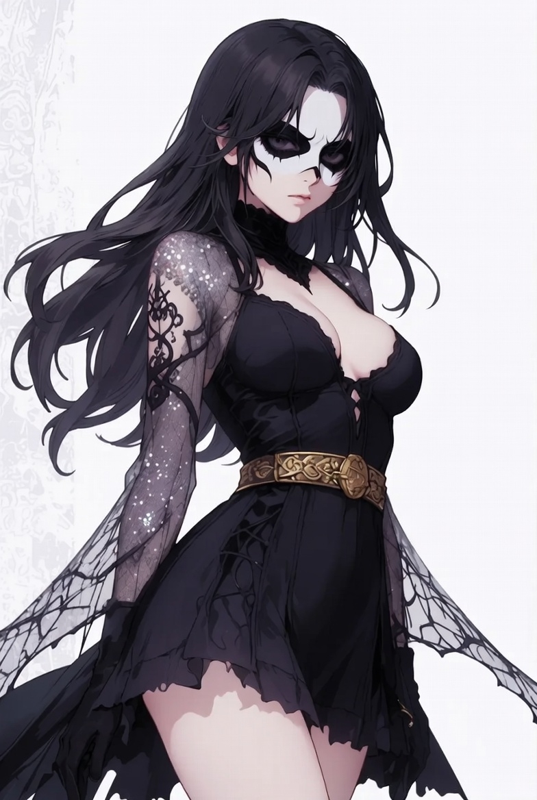 art, beauty, black dress, captivating, character design, costume, dark theme, dramatic, elegance, ethereal, fantasy, fashion, long hair, mask, mysterious figure, portrait, shadows, striking, style, twilight