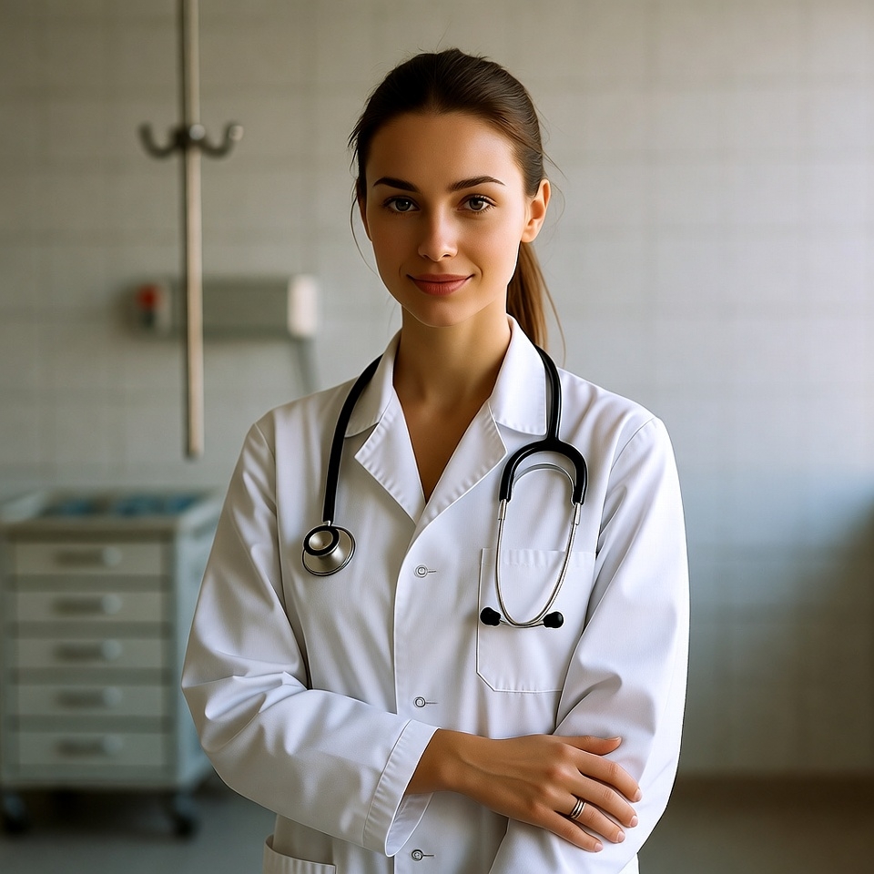A young female doctor stands confidently in a hospital room, dressed in a white coat and stethoscope, ready to help patients.