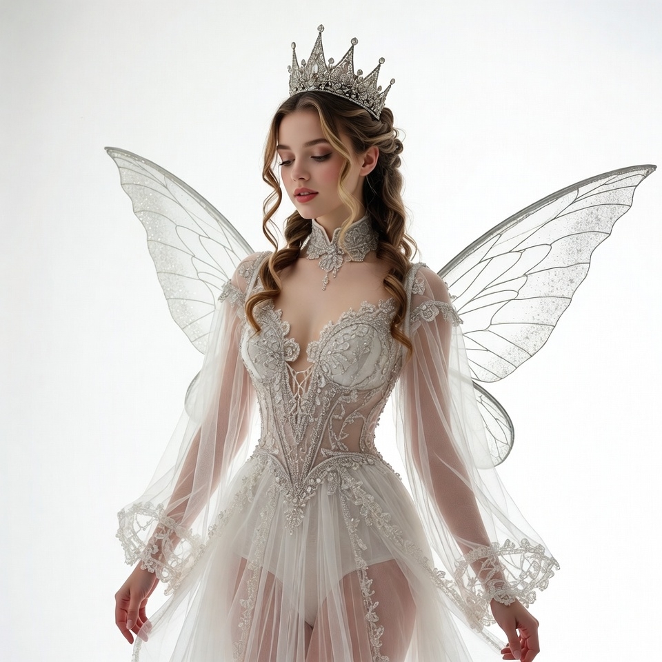 A model showcases a stunning fairy costume featuring intricate details, delicate wings, and a sparkling crown, creating a magical atmosphere.