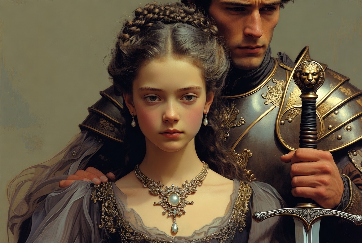 atmosphere, attire, attire details, beauty, couple, elegance, facial expression, grace, hairstyle, historical, honor, jewelry, knight, loyalty, medieval, noblewoman, portrait, regal, strength, sword