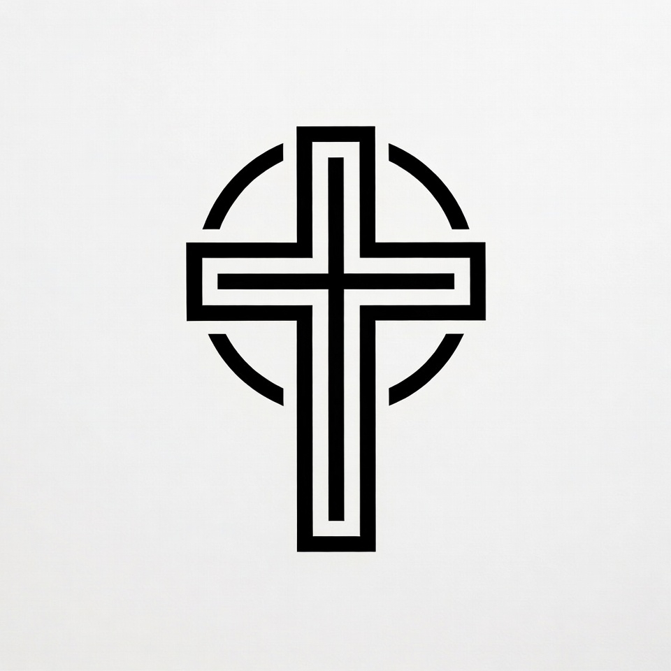 A black outline of a cross sits in the center of a circular shape on a white background, emphasizing its clean, modern aesthetic.