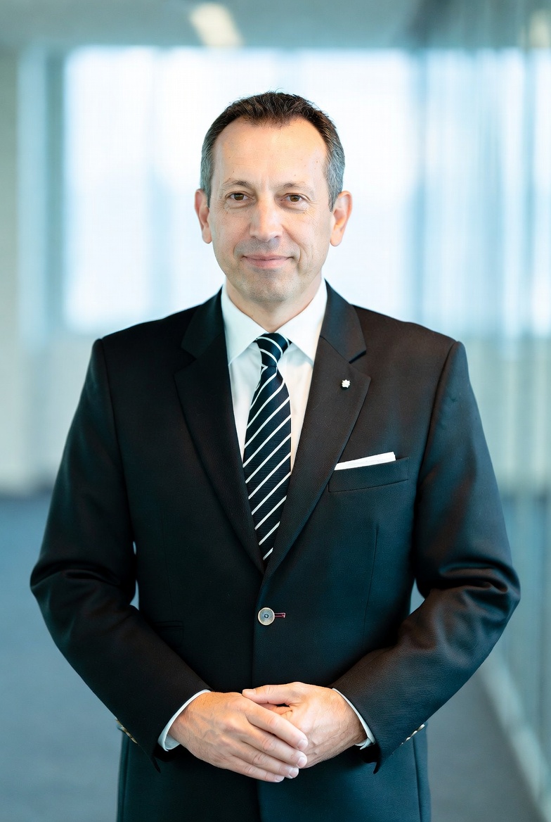 A man in a black suit poses with a calm expression in a modern office. Natural light illuminates the workspace, highlighting the glass walls.