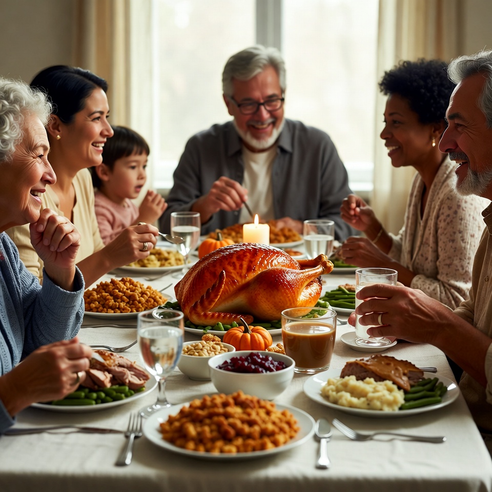 celebration, conversation, cozy, dining room, dinner, drinks, family, food, friends, gathering, happiness, holiday, joy, laughter, meal, table, together, tradition, turkey, vegetables