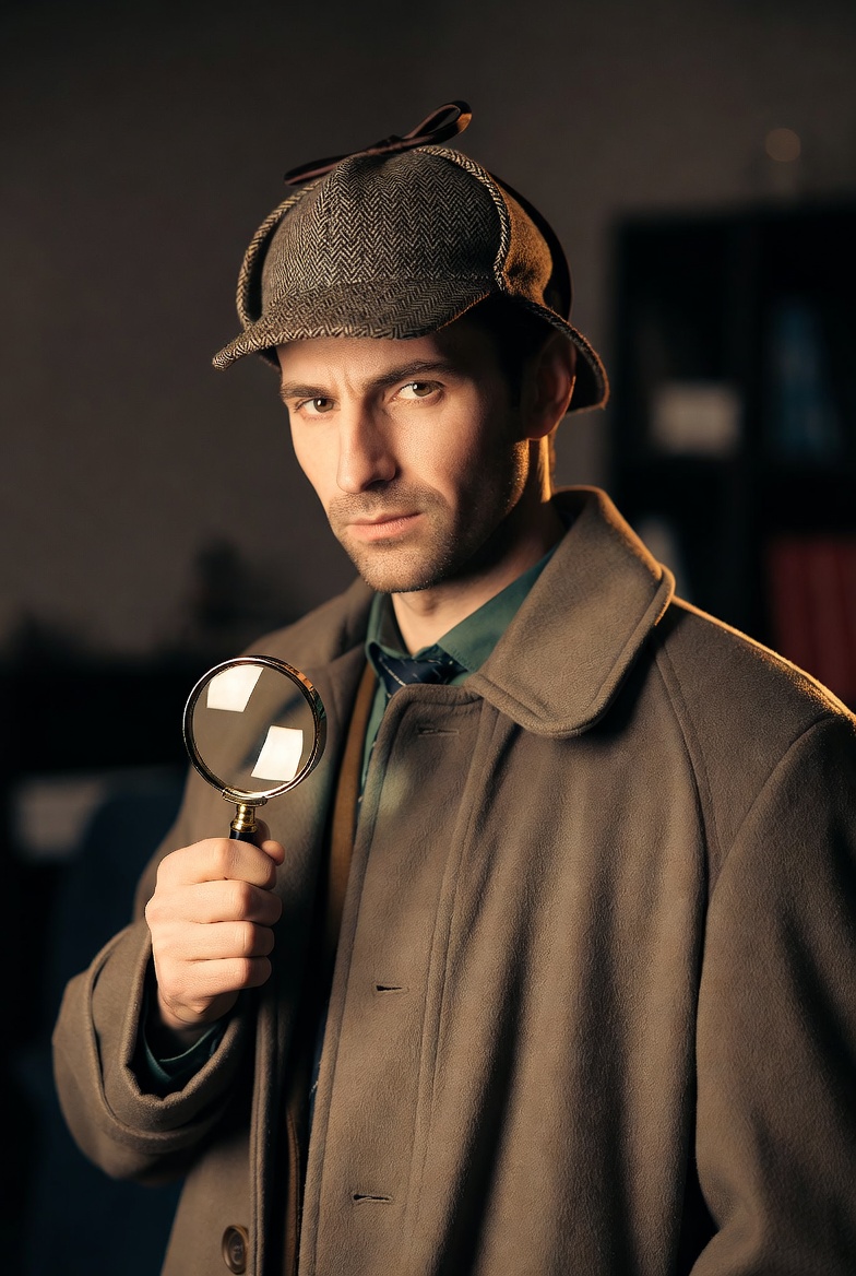 analysis, close examination, coat, cozy setting, detective, detective character, dim lighting, focus, hat, indoor, investigation, looking, magnifying glass, man, mystery, props, serious expression, suspense, traditional, vintage attire