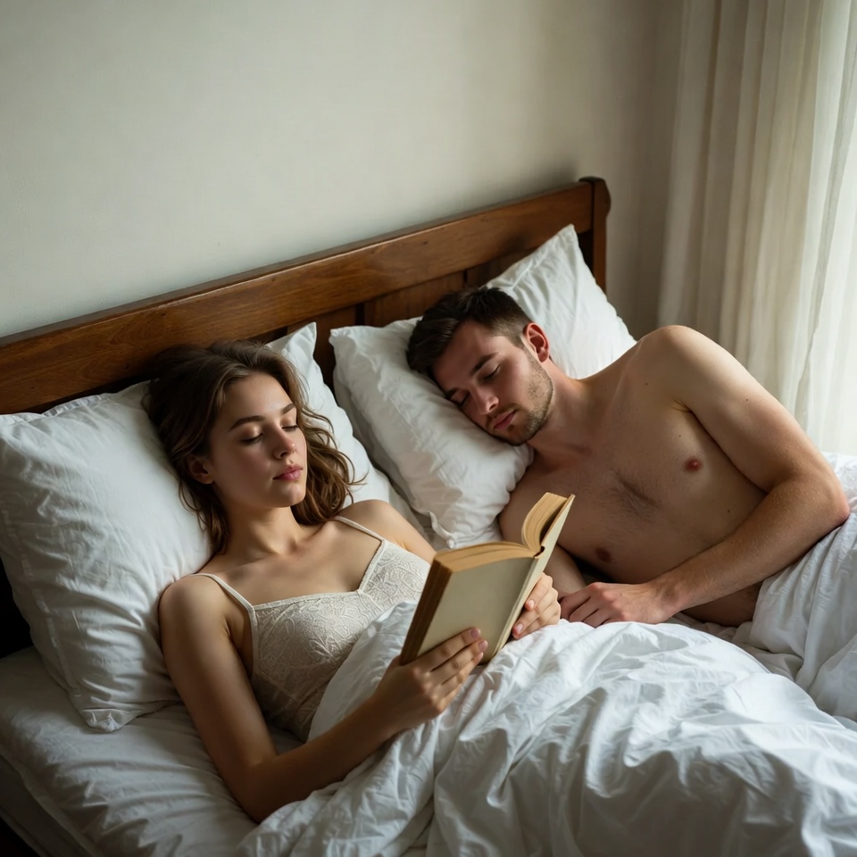 afternoon, bed, bedroom, book, comfort, couple, home, intimacy, leisure, lifestyle, peaceful, quiet, reading, relaxing, romance, serene, sleep, soft light, togetherness, young