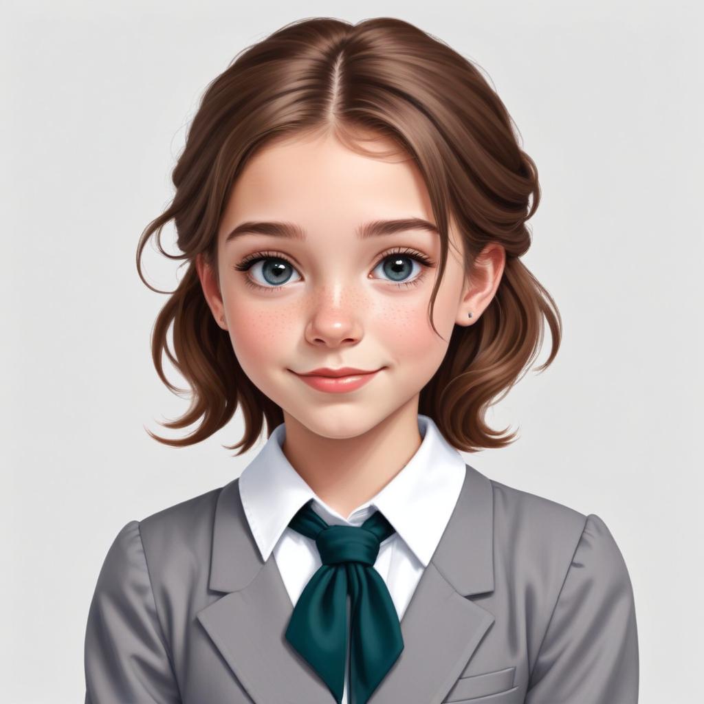 A young girl with brown hair smiles in a formal outfit, featuring a grey blazer and a dark tie, showcasing confidence and charm.