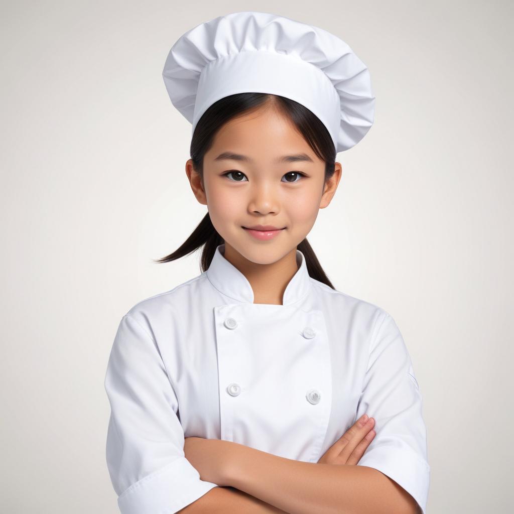 A young girl in a white chef uniform and hat stands with her arms crossed, smiling brightly. She exudes confidence and passion for cooking.