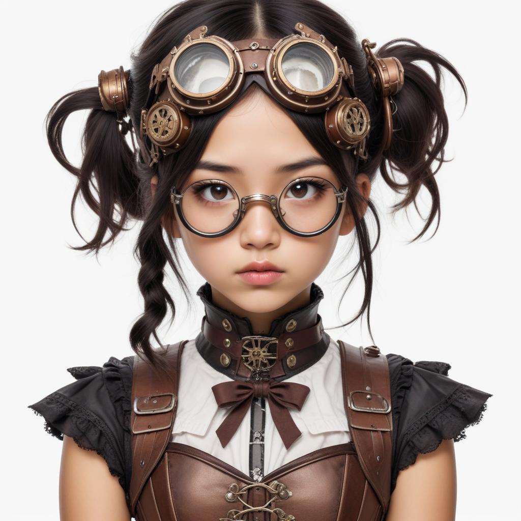 accessories, artisan, character, craftsmanship, creative outfit, expression, fantasy, fashion, goggles, hairstyle, imaginative style, industrial, inventor, playful, portrait, posing, steampunk, unique design, vintage, young girl