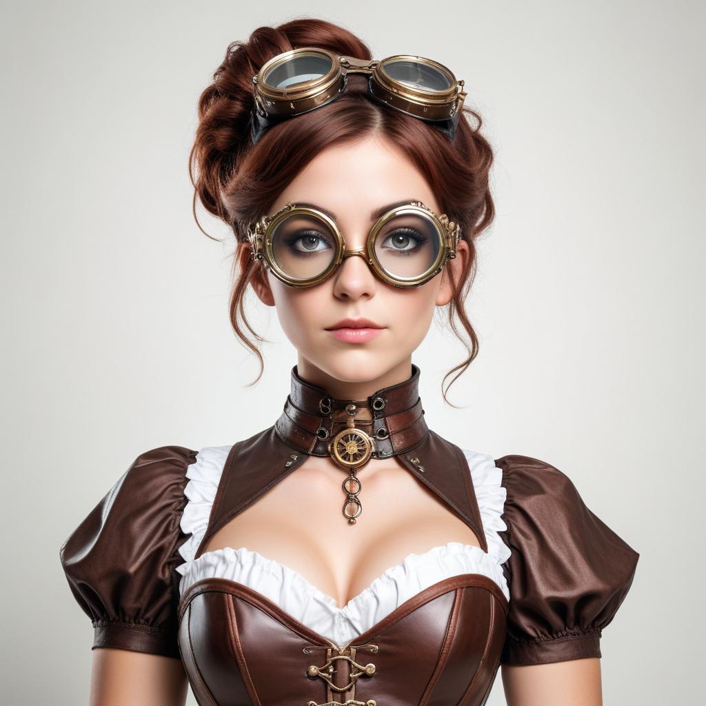 A model in a brown steampunk outfit poses confidently with stylish goggles, showcasing a blend of vintage and futuristic fashion elements.