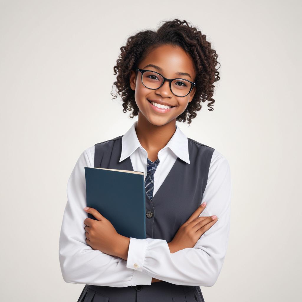 academic, bright, cheerful, classroom, confidence, curly hair, education, girl, glasses, happy, learning, notebook, portrait, school, smiling, student, teaching, teenager, uniform, young