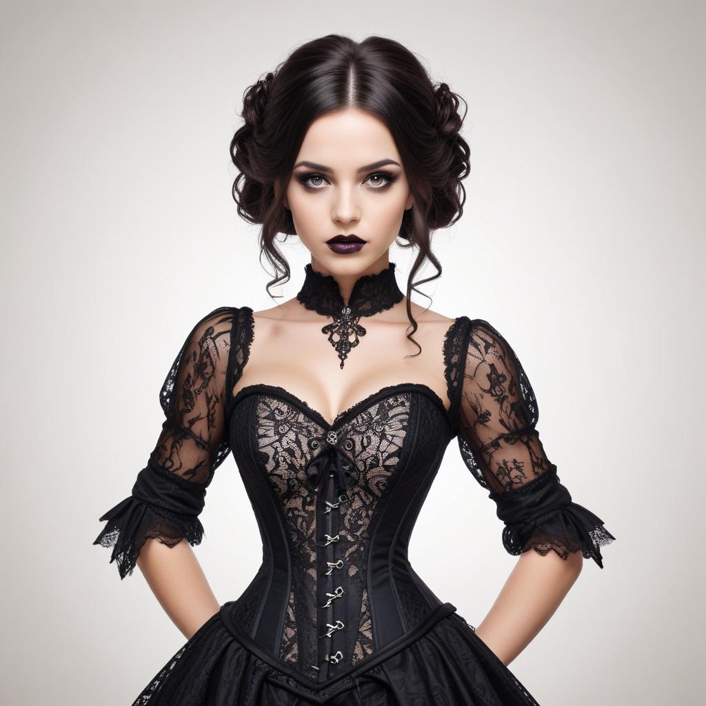 A woman in a gothic dress poses confidently in a studio, showcasing intricate lace details and dark makeup that enhance her striking features.