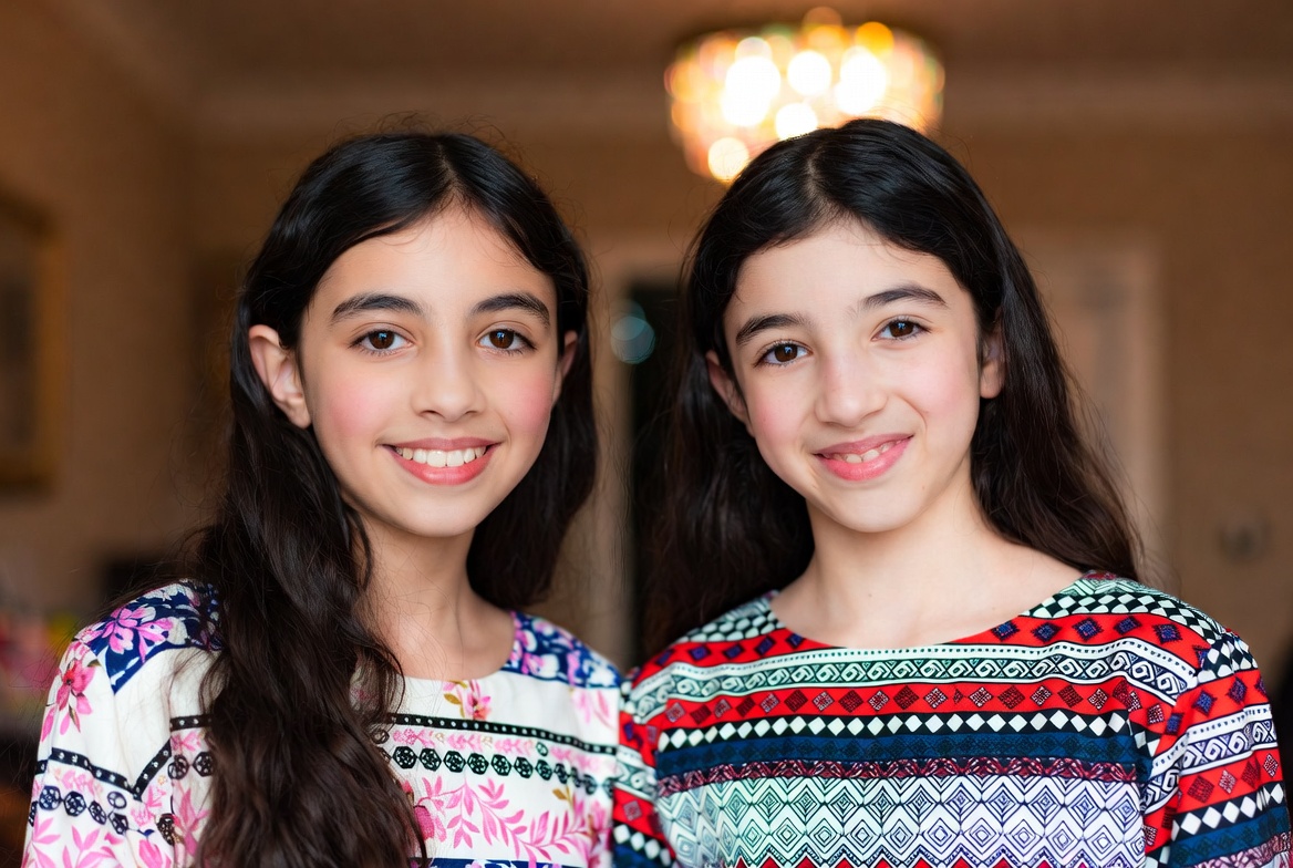 bright, casual wear, childhood, cozy, decor, elegant, family, friendship, girls, girls' fashion, happiness, indoor, joy, love, patterns, portrait, smiling, together, twin sisters, warm