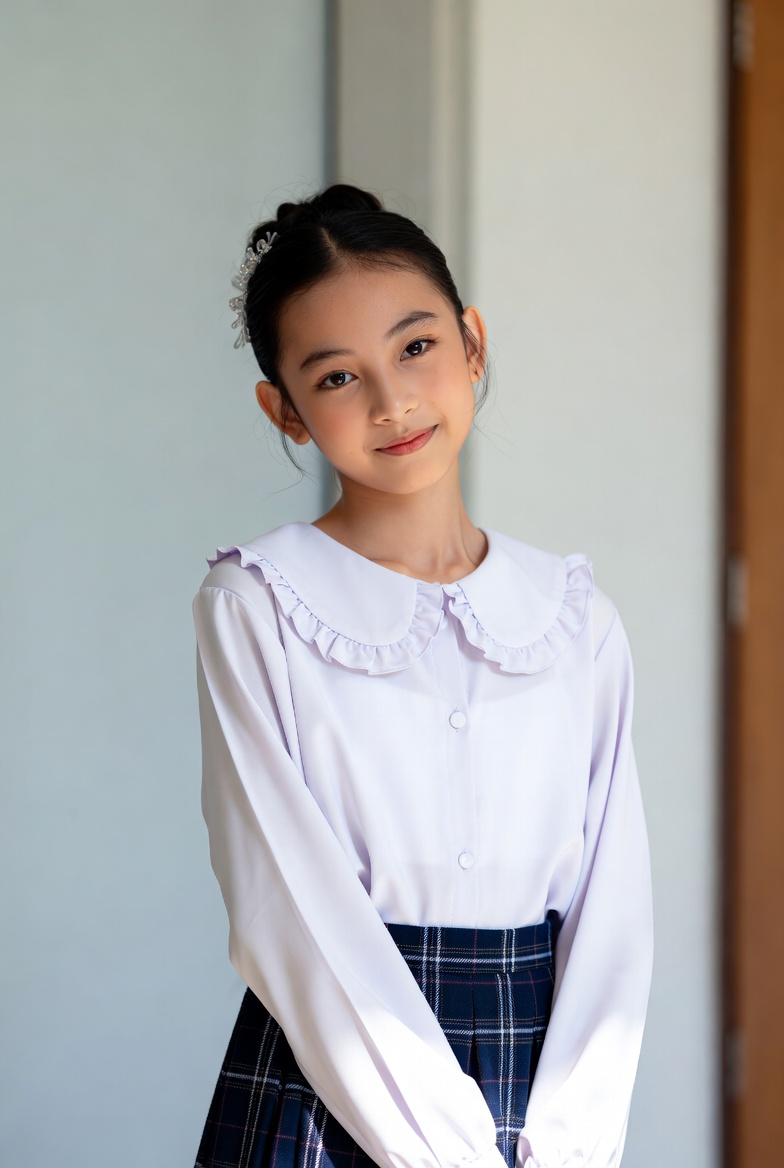 A young girl stands confidently in her school uniform, smiling softly with a simple hairstyle, in a well-lit indoor space.